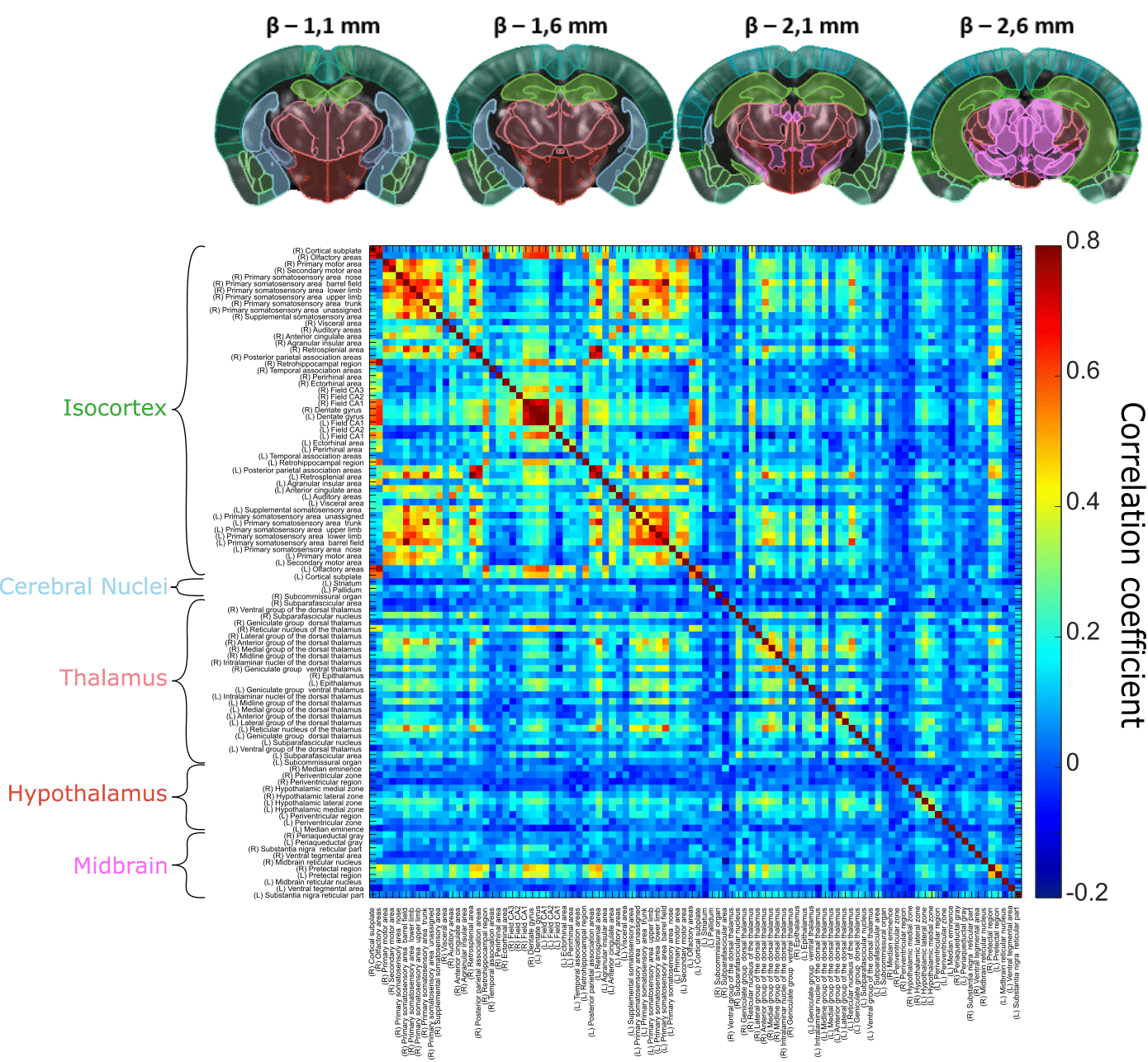 Generating connectivity matrices in two dimensions involves investigating responses from a single coronal plane, as illustrated here for a mouse model.