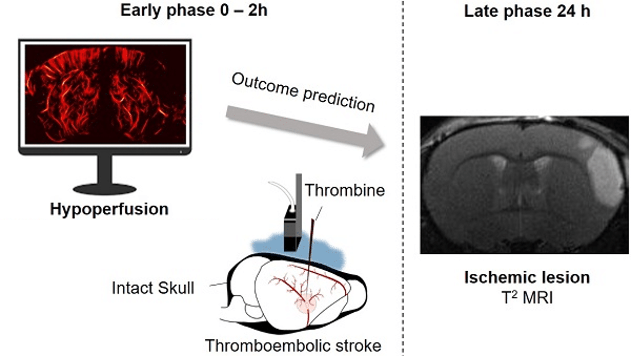 The later study shown in the figure provides a proof-of-concept for the additional resolution possible by using fUS with Ultrasound Localization Microscopy. In this collaboration between PhysMed and the team of Professor Denis Vivien at Normandy University, it was found that imaging of cerebral perfusion correlates with ischemic stroke outcomes and responses to treatment in mice.