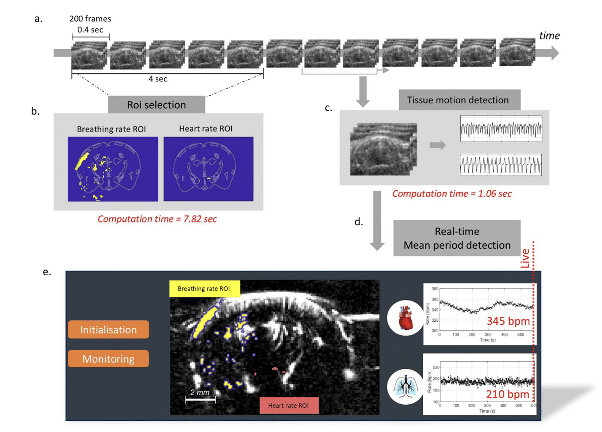 However, using the various methods for monitoring heart and breathing rates during fUS or fMRI neuroimaging studies on small animals is fraught with challenges. For example, electrodes remain the reference device for acquiring this data, but because they need to be implanted, they are only usually compatible with anesthetized rodents – precluding their use as part of fUS studies on awake, active animals.