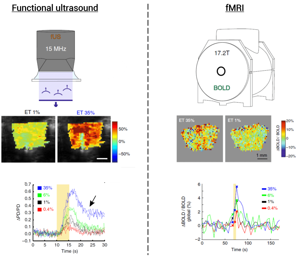 Functional magnetic resonance imaging (fMRI) using the blood-oxygen-level-dependent (BOLD) response is the ‘gold standard’ for deep brain imaging in humans. But its restricted spatial and temporal resolution makes it of limited use when looking at small animals in preclinical settings (especially mice). Also, the small responses generated by BOLD mean that you need to take an average of many experiments to get an acceptable signal-to-noise ratio.